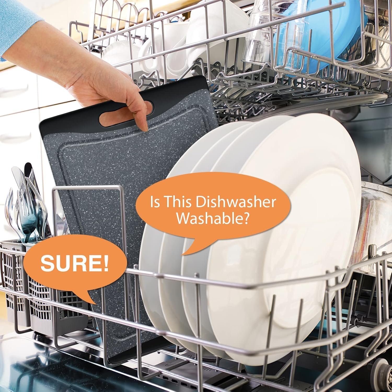 - 【BUILT-IN JUICE GROOVE】 All sides of the plastic cutting board is designed with a juice groove to catch liquids from flowing onto your counter, keeping the countertop beautiful at all times. And these plastic cutting boards equipped with TPR edge handle, which can be firmly fixed in place when you prepare food. And the handle design is also very convenient and easy to store.