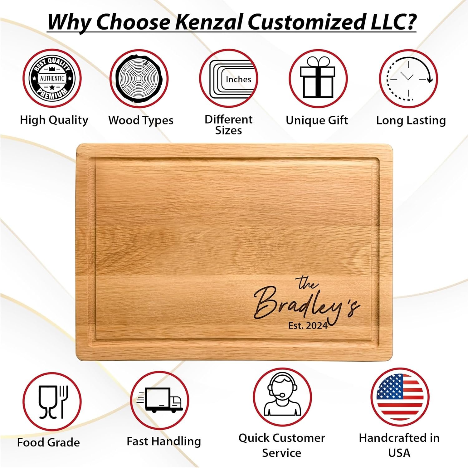 • 100% CUSTOMER SATISFACTION GUARANTEED! – Kenzal Customized LLC is a company specializing in creating truly memorable, unique, beautiful, and durable personalized gifts and home decor products for you and your loved ones. Our products are Handcrafted in the USA. We offer high-quality products like this customized cutting board with the best possible customer experience. Your happiness is our top priority. You can contact with our friendly team at any time with questions or comments.